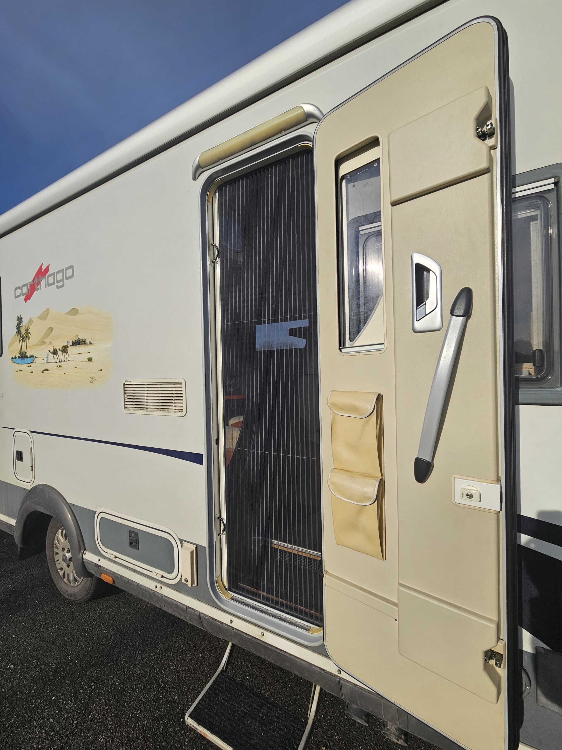 Panneau solaire, batterie cellule, store latéral, moustiquaire sur porte d’entrée, attelage